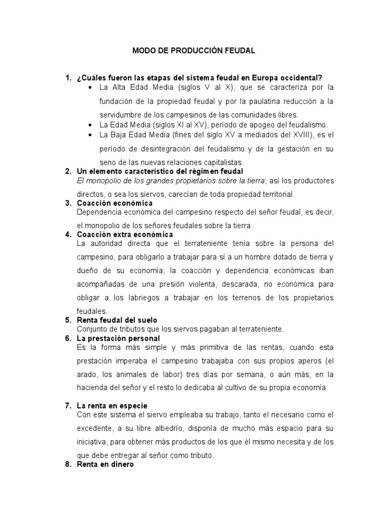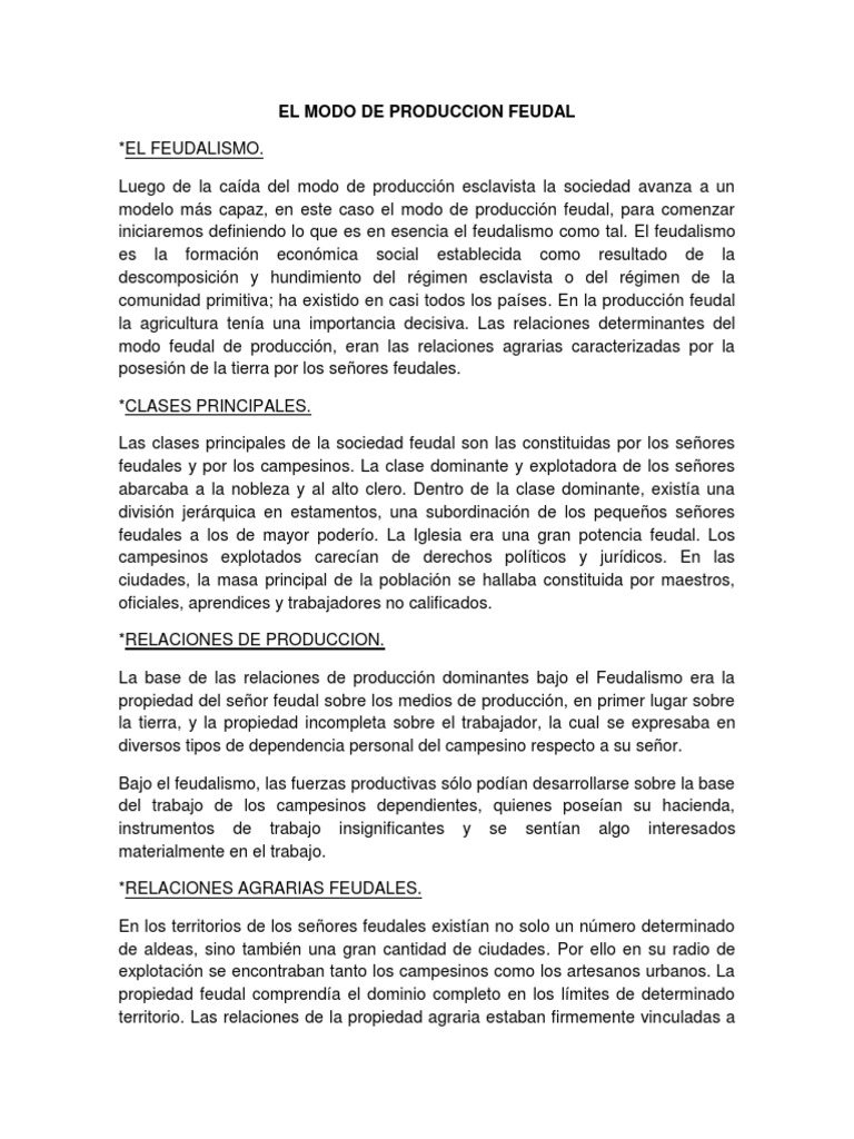 Modo de produccion feudal resumen Preview Preview El modo de produccin feudal fue uno de los modos de organizacin de la produccin existentes. Qu es el modo de produccin feudal. Las consecuencias de las principales clases sociales en esta etapa son maestros federales y sirvientes estancados de la Irisba.