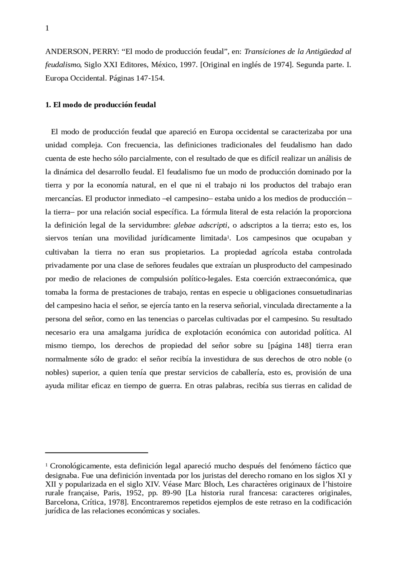 Anderson Perry El Modo De Produccion Feudal En Transiciones De La Antiguedad Al Feudalismo Docsity